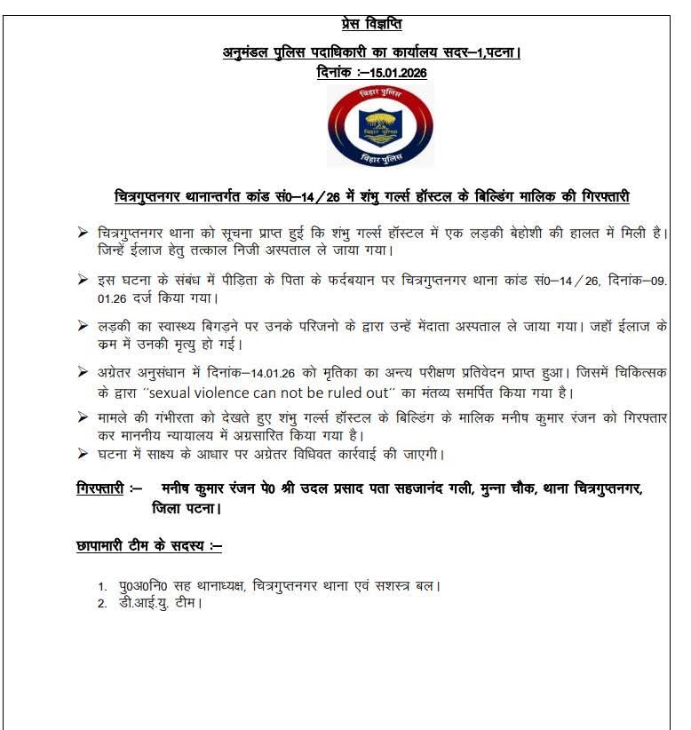 जानकारी के अनुसार, 6 जनवरी की सुबह चित्रगुप्त नगर थाना पुलिस को सूचना मिली कि शंभू गर्ल्स हॉस्टल में एक छात्रा बेहोशी की हालत में पाई गई है। आनन-फानन में छात्रा को इलाज के लिए एक निजी अस्पताल में भर्ती कराया गया, जहां वह दो दिनों तक जीवन और मौत से जूझती रही।